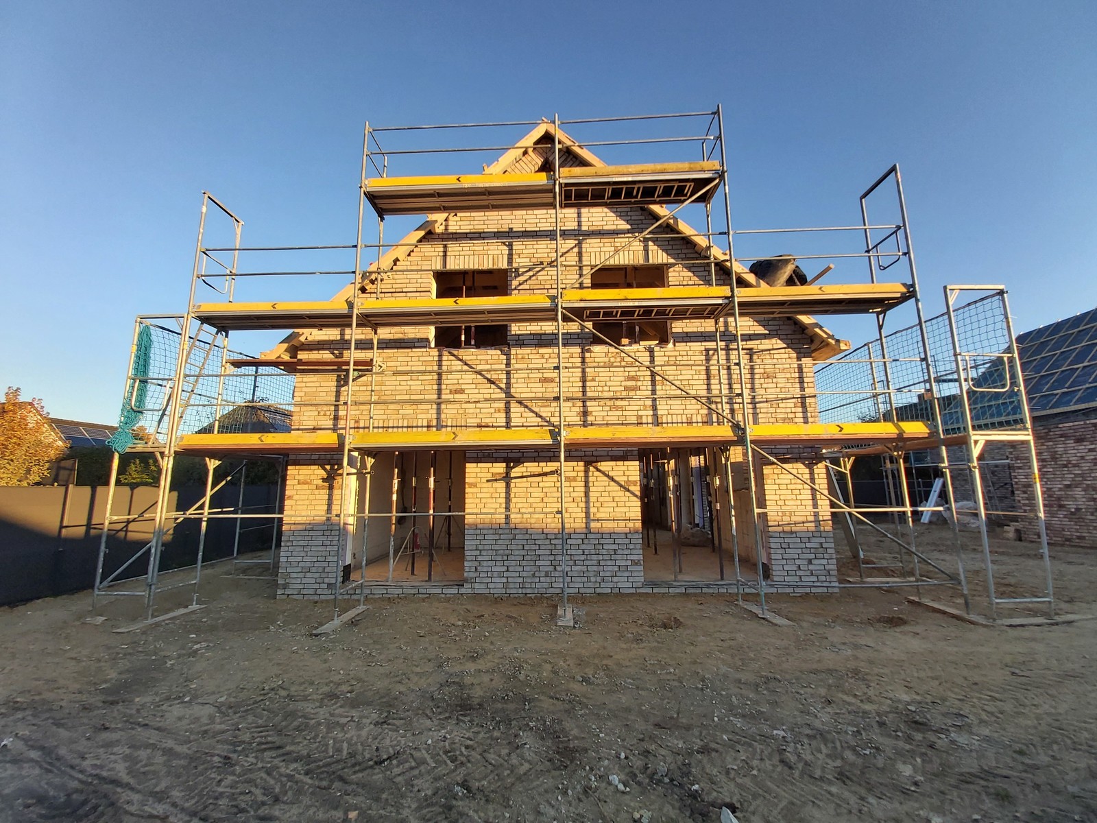 Wir bauen drei Giebelhäuser auf einem Grundstück in Sudweyhe. Die Verblendsteine sind nun an allen drei Häusern verarbeitet, die Außenfassade ist fertig. Unsere Bauherren können aus vielen unterschiedlichen Klinkern- oder Backsteinen wählen. Unser Hansa-Wohnflex-Programm bietet über 75 Klinkervarianten im Normalformat ohne Mehrkosten.Wir halten Euch auf dem Laufenden….